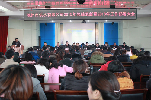 2016年1月8日,池州市供水公司2015年總結(jié)表彰暨2016年工作布署大會(huì)在公司四樓會(huì)議室召開。公司董事長(zhǎng)鐘誠(chéng)、總經(jīng)理吳小平等全體高管及公司全體員工參加會(huì)議,池州市國(guó)資委、池州市住建委、池州市公用事業(yè)局、深圳水務(wù)投資公司、池州市水業(yè)投資公司等領(lǐng)導(dǎo)蒞臨會(huì)議。
