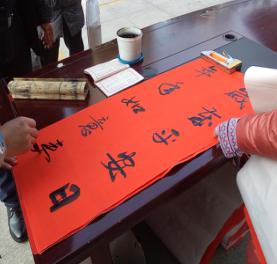 活動(dòng)的開展吸引了不少轄區(qū)居民的關(guān)注和參與。“一帆風(fēng)順吉星到,萬事如意福臨門”等喜慶的話語充滿了濃濃的年味。只見周先生氣沉丹田,筆走龍蛇,潑墨揮毫,不一會(huì)兒,一幅幅散發(fā)著清新墨香的喜慶大紅春聯(lián)展現(xiàn)在人們眼前,居民們一邊欣賞書法創(chuàng)作,一邊品評(píng)春聯(lián)寓意,現(xiàn)場一派歡樂景象?头行囊幻ぷ魅藛T忙著給書法家打下手,摁紙、拉平,攤開、小心翼翼的,生怕弄壞了,并將一幅幅寫著吉祥祝福的春聯(lián)送到前來觀看的居民手中。拿著剛剛寫好的春聯(lián),居民們喜笑顏開,很多春聯(lián)作品還都未等墨跡干透已經(jīng)被領(lǐng)走了,整場活動(dòng)共送出春聯(lián)100余幅。