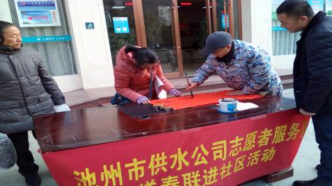 無聯(lián)不成春,有聯(lián)春更濃。為迎接新春佳節(jié),營造喜慶祥和的節(jié)日氣氛,2017年1月17日上午八點(diǎn)半,池州市供水有限公司在客戶服務(wù)部客服中心大門前開展了“迎新春、寫春聯(lián)送春聯(lián)”活動(dòng),為轄區(qū)居民送去春聯(lián)和新春的祝福。公司特邀請(qǐng)了池州書法協(xié)會(huì)會(huì)員周先生,在現(xiàn)場為轄區(qū)居民群眾書寫春聯(lián)。