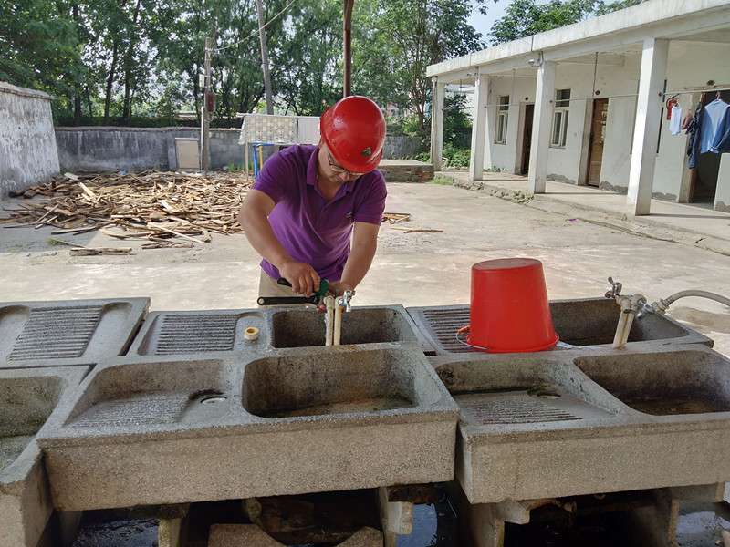 25日清早,大雪紛飛,錢(qián)程剛泡好茶正準(zhǔn)備喝上一口,就接到用戶(hù)打來(lái)的電話(huà),反映江口村幾戶(hù)家中無(wú)水,他二話(huà)沒(méi)說(shuō)立即帶上工具趕往現(xiàn)場(chǎng)。到達(dá)現(xiàn)場(chǎng)后詢(xún)問(wèn)后得知該村有兩個(gè)組共六十余戶(hù)沒(méi)水或家中水小,他很著急,心想:這個(gè)大雪天,村里60多戶(hù)老老少少?zèng)]有水怎么生活!刻不容緩,他立即圍繞這兩個(gè)組周?chē)墓芫W(wǎng)進(jìn)行巡查,憑他多年維修經(jīng)驗(yàn)判斷感覺(jué)是管道漏水泄壓造成的,經(jīng)過(guò)1個(gè)小時(shí)的巡查,果然在一個(gè)池塘邊發(fā)現(xiàn)一處DN63PVC管道裂開(kāi),水正往池塘里漏,他立刻關(guān)閥止水,并立刻拿來(lái)?yè)屝薰ぞ咝迯?fù)管道,冰雪天,冷水刺骨,在冷水里泡了1個(gè)多小時(shí)雙手早已凍的發(fā)紫,他咬牙堅(jiān)持著,終于將管道修復(fù)好,村里60多戶(hù)村民能用上水了,可此時(shí)的他已快成為一個(gè)雪人了,村民們感動(dòng)的都要紛紛拉他到家里喝上杯熱茶暖暖身子,“這是我應(yīng)該做的”說(shuō)完后,錢(qián)程就急著要趕到另一個(gè)搶修現(xiàn)場(chǎng)。
