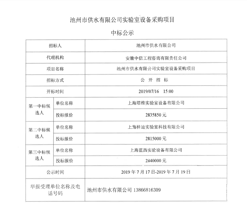 | 池州市供水有限公司實驗室設(shè)備采購項目中標(biāo)公示 | |