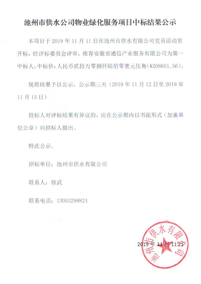 | 池州市供水公司物業(yè)綠化服務項目中標結果公示 | |