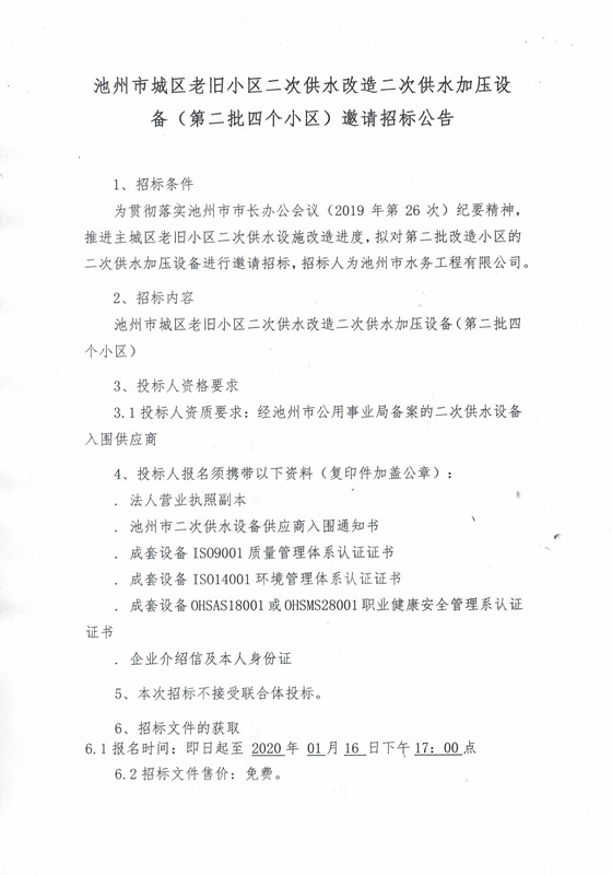 | 池州市城區(qū)老舊小區(qū)二次供水改造二次供水加壓設(shè)備(第二批四個小區(qū))邀請招標公告 | |