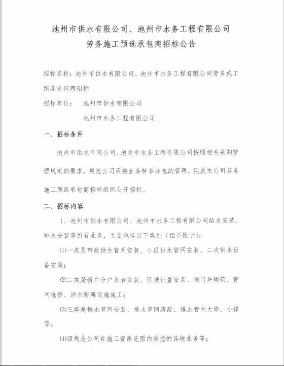 招標名稱:池州市供水有限公司、池州市水務工程有限公司勞務施工預選承包商招標