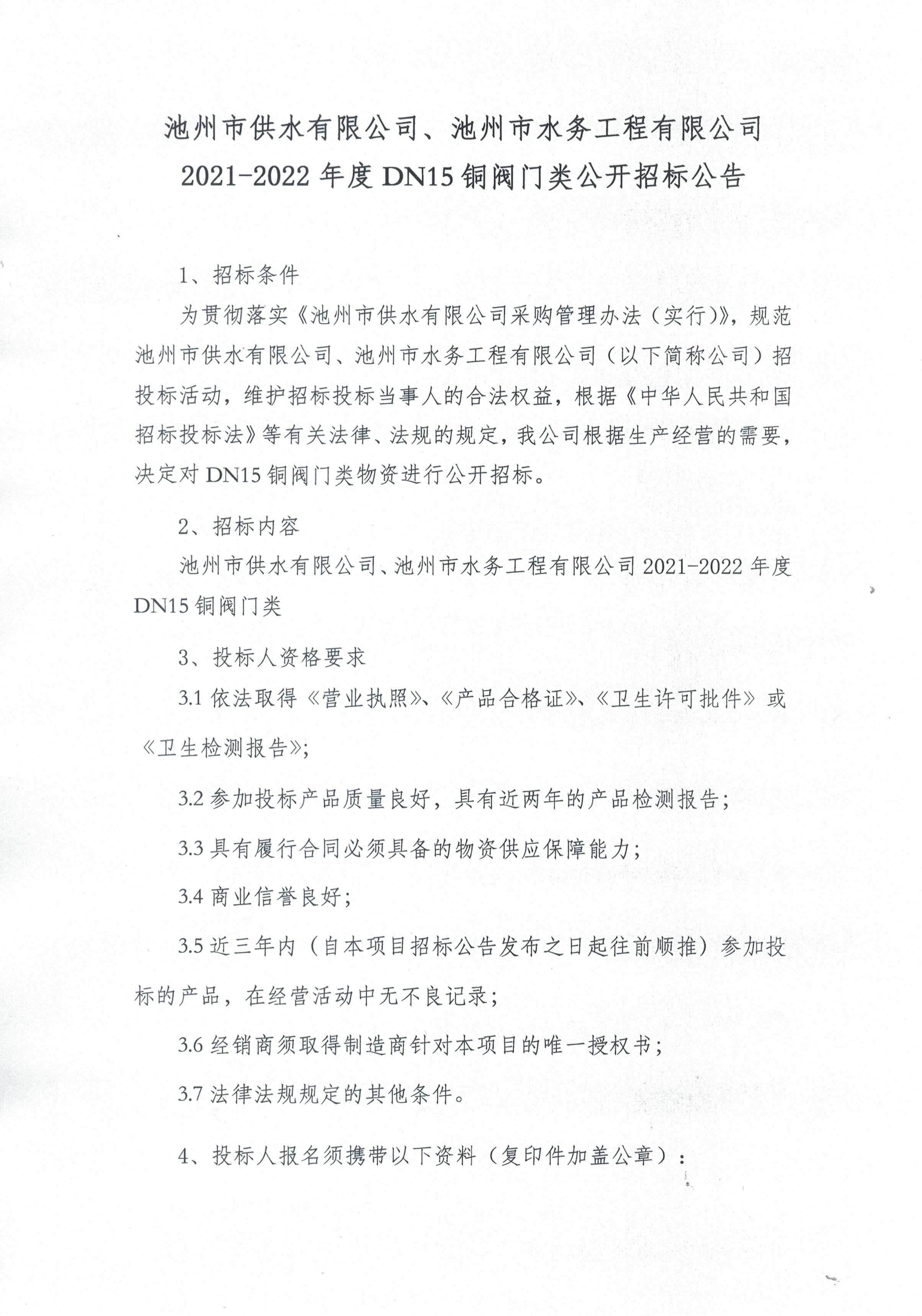 | 池州市供水有限公司、池州市水務(wù)工程有限公司2021-2022年度DN15銅閥門類公開招標公告 | |