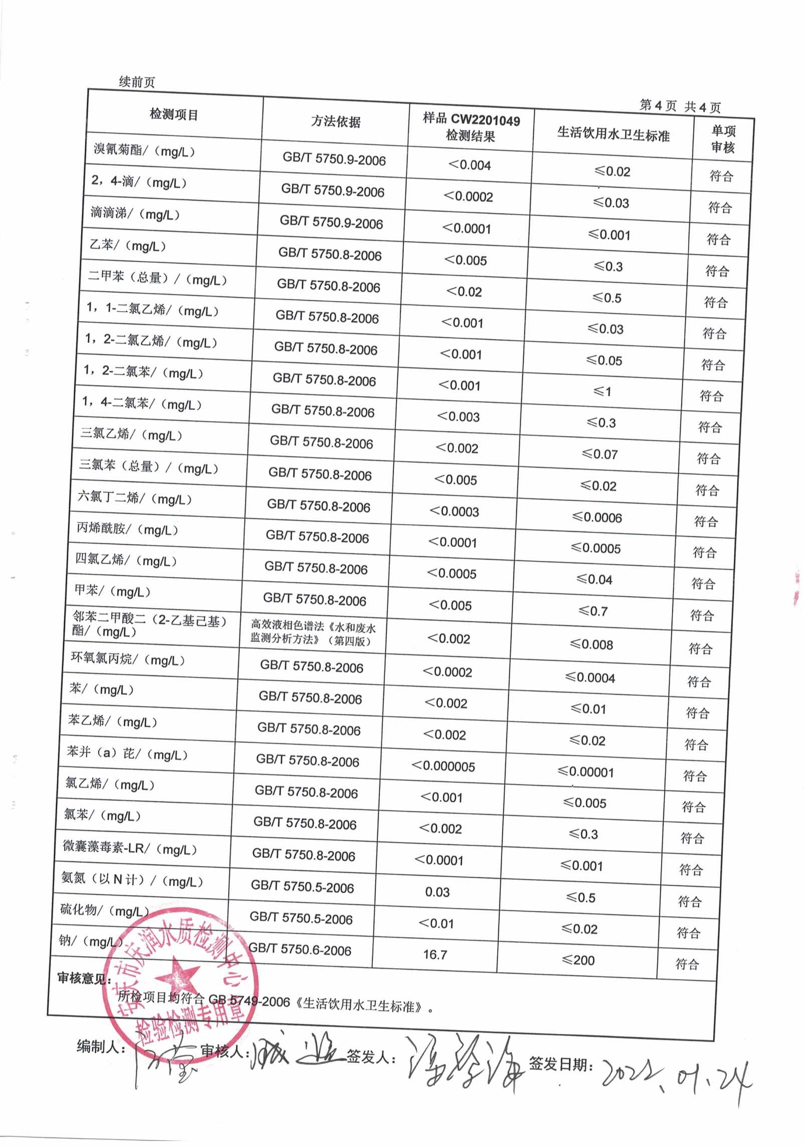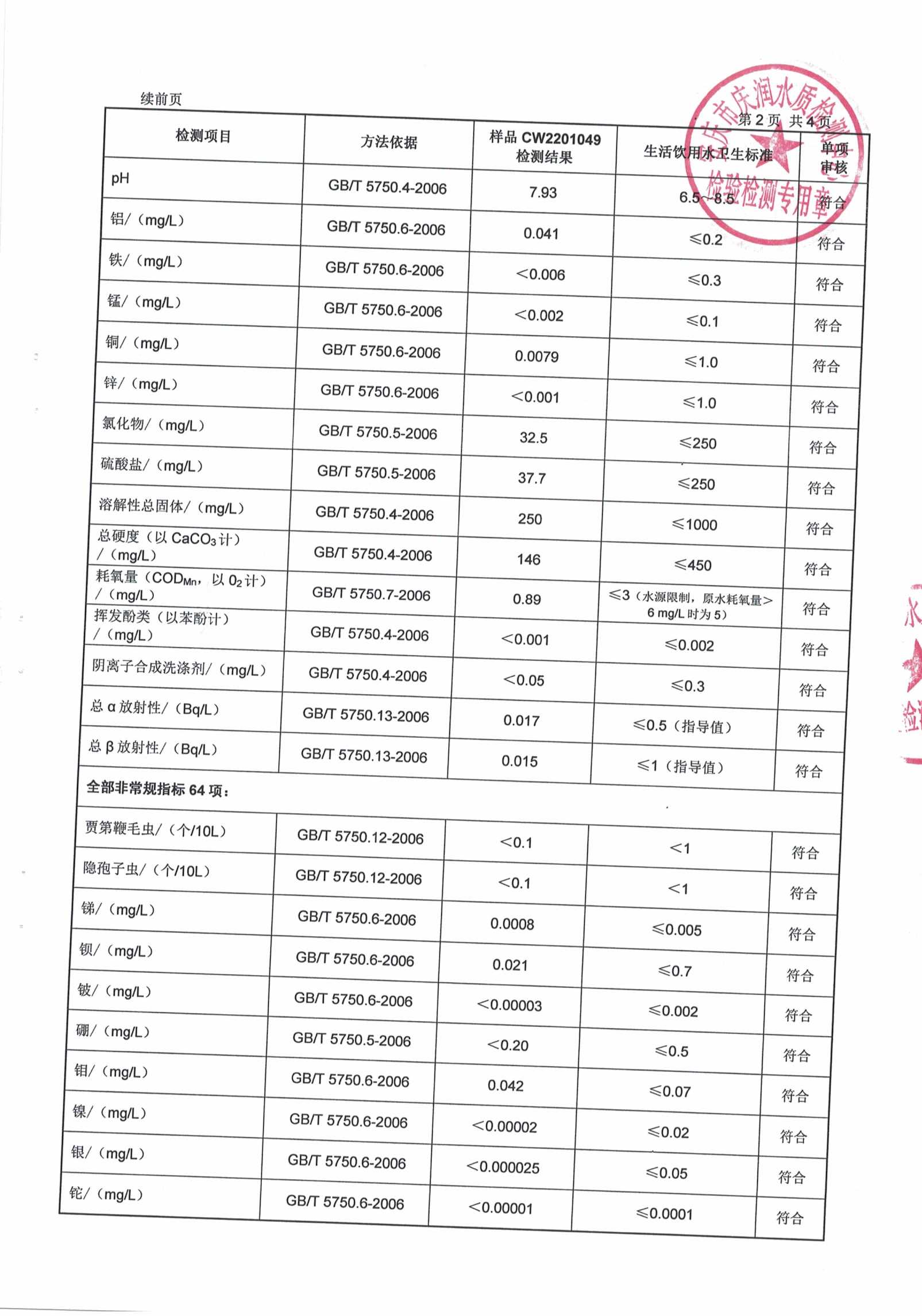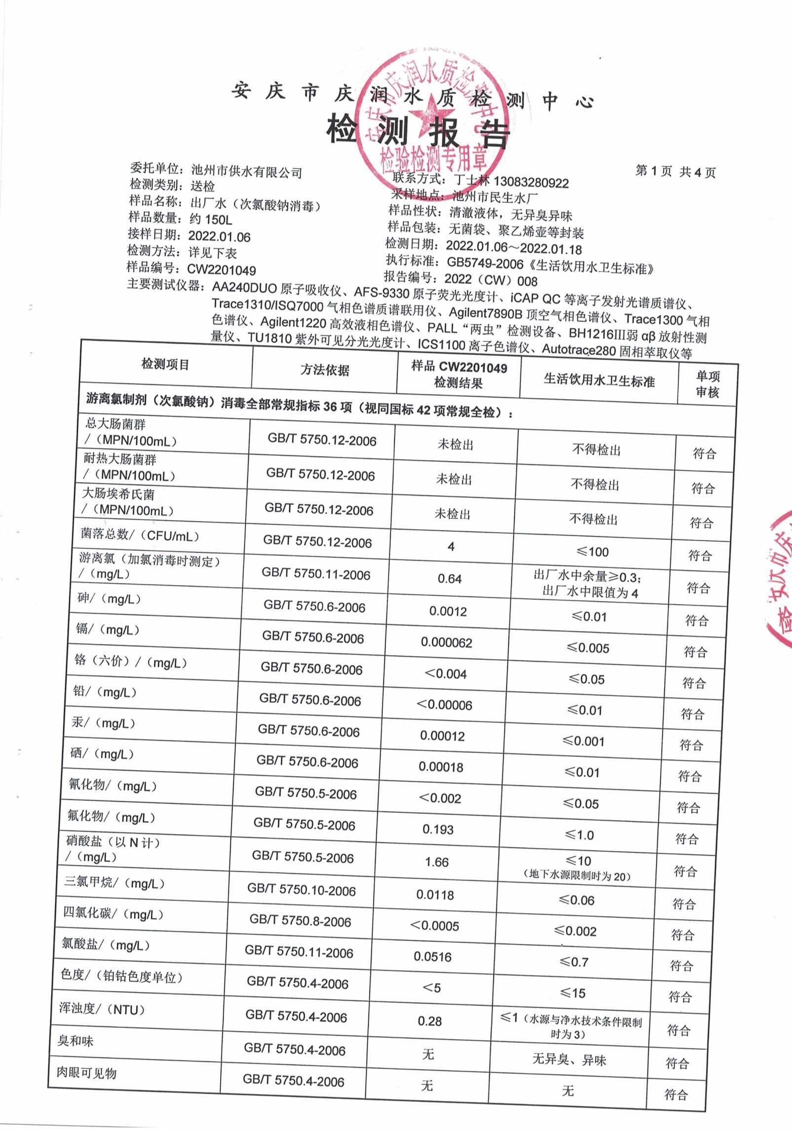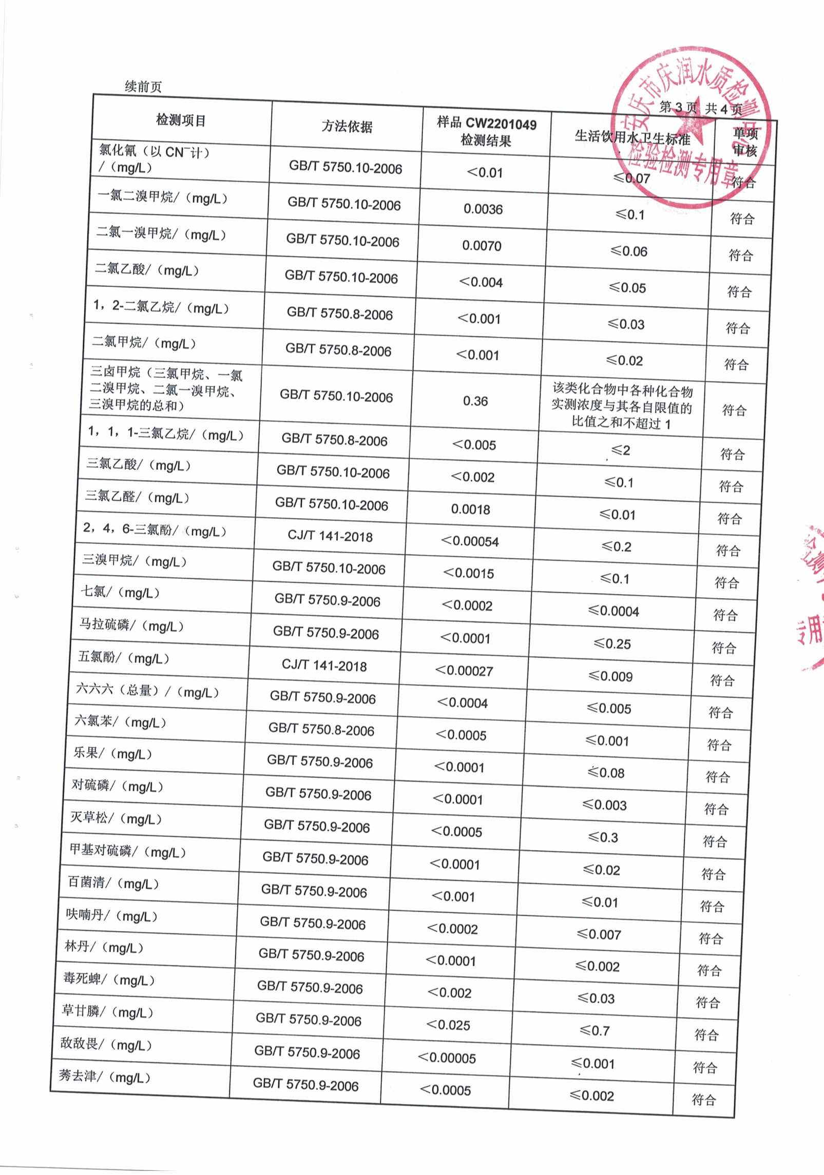 | 民生水廠出廠水106項水質(zhì)檢測報告 | |