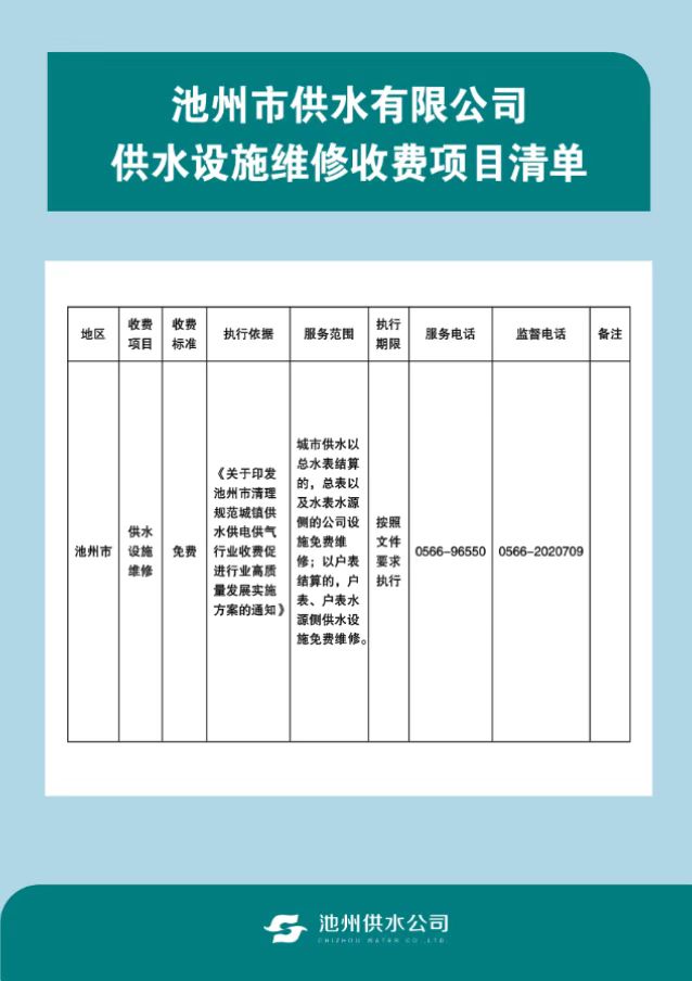 | 池州市供水有限公司供水設(shè)施維修項(xiàng)目收費(fèi)清單 | |