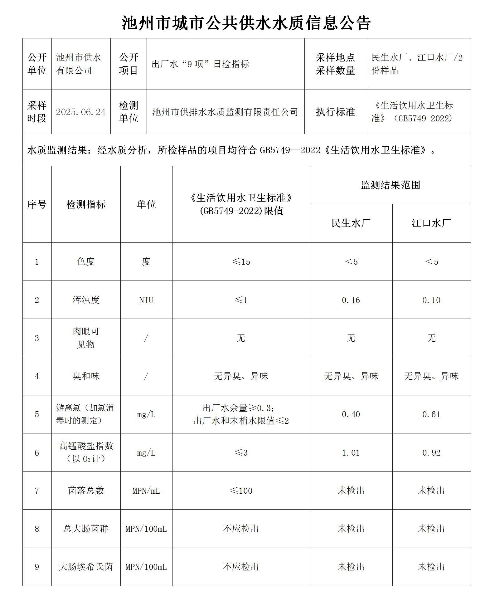 | 池州市城市公共供水水質(zhì)信息公告出廠水“9項(xiàng)”日檢指標(biāo)2025.06.24 | |