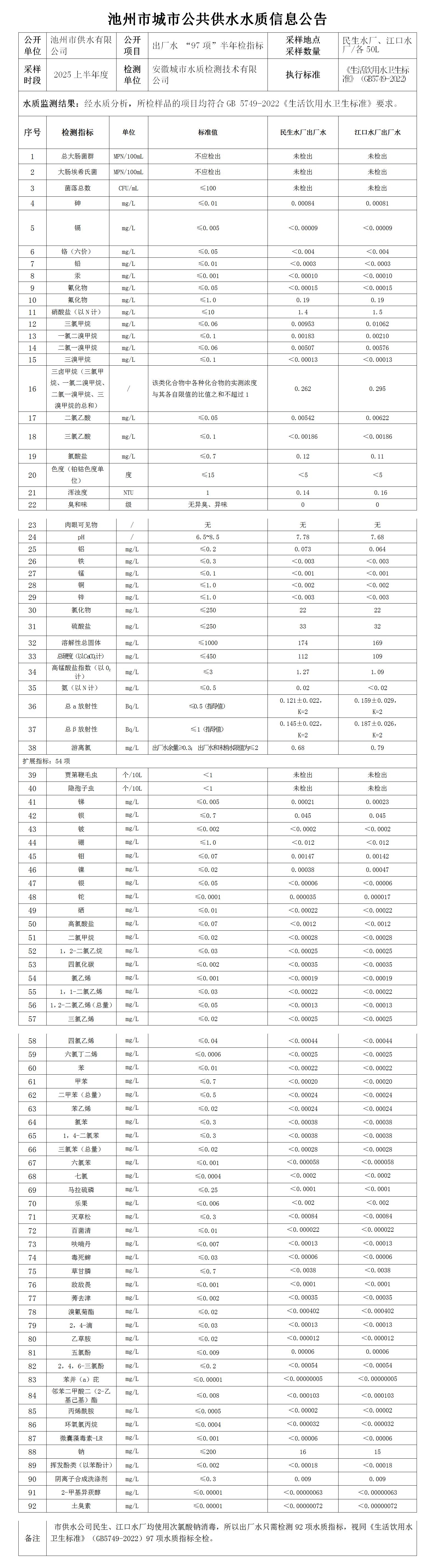 | 池州市城市供水水質(zhì)信息公告出廠水“97項(xiàng)“2025年上半年全指標(biāo) | |