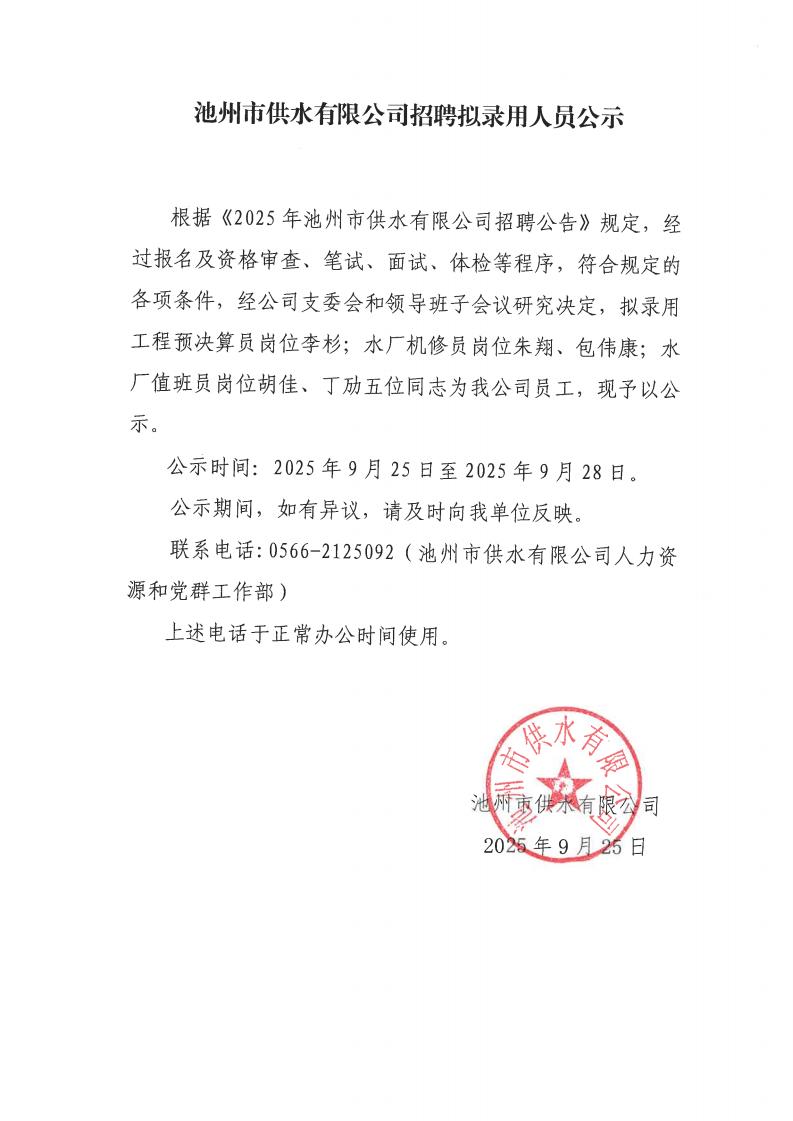 | 池州市供水有限公司招聘錄用人員公示 | |