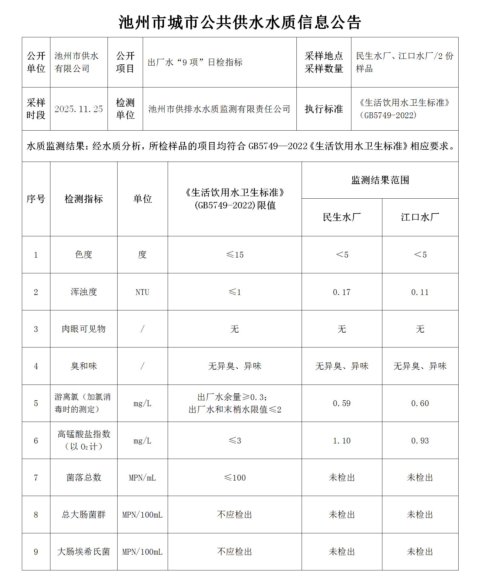 | 池州市城市公共供水水質(zhì)信息公告出廠水“9項(xiàng)”日檢指標(biāo)20251125 | |