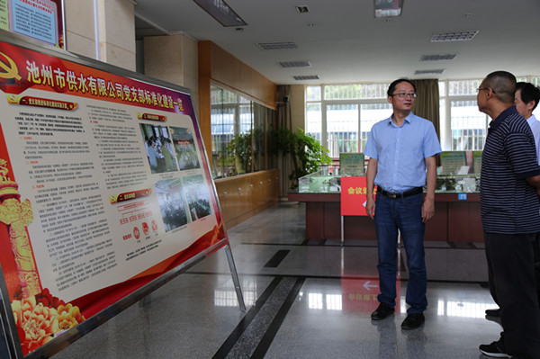 2017年8月10日,省委組織部城市組織處調(diào)研員、副處長李欣一行就黨建標(biāo)準(zhǔn)化工作蒞臨池州市供水有限公司進(jìn)行專題調(diào)研。市委組織部副部長陳效山、市委組織部城組科科長嚴(yán)艷、市國資委副主任金緒友等同志陪同調(diào)研。